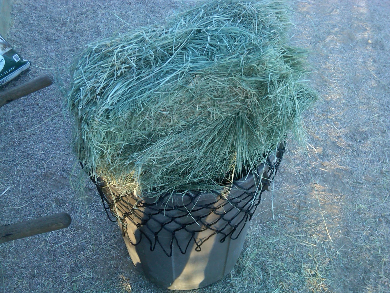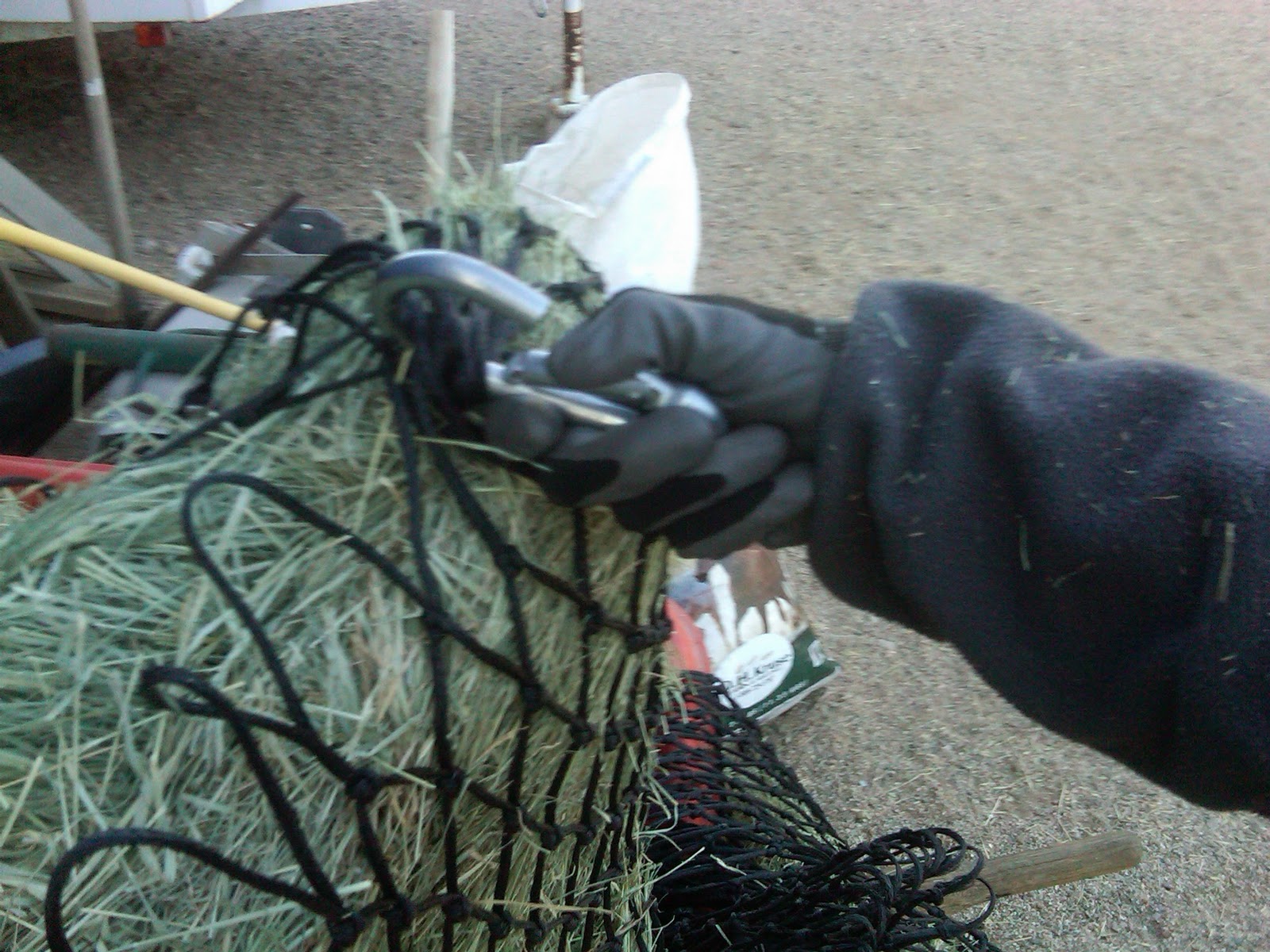 Small Mesh Hay Netsby Patti Woodbury Kuvik I love my small mesh hay nets. I use them for "portion control" for Choli - my IR mare - when she's kept up in her dry lot. I also use them for everyone on windy days - I hang some from fences and also place some around their turnout area as "pillows". By using a spring snap clip instead of a cord  to close the top, there isn't anything large enough to get a hoof caught in.  These are the small mesh hay nets from Chick's Discount Saddlery.  They're larger than the ones I got previously from Smith's. This is about ten pounds of Bermuda hay - a heavy "double" flake or two smaller flakes. The nets can stretch to hold more. I usually set it up on the wheelbarrow for a convenient height to put the clip on. I weave the clip - a 4" spring snap hook - through the top loops. I have not had any problems with my horses getting caught in these. The 4" hook works well, any smaller is difficult to hold all the loops. I clip the full hay bag to a loop of baling twine. I tried using fancier methods but found this works best. If were feeding alfalfa I would definitely use mats under the nets as horses will pick up everything while picking up the leaves. I currently have sixteen of these for four horses. I like to keep them stuffed ahead of time and, when they're all turned out together, use at least five or six filled nets. When it's not windy out, I often put out a "trail" of hay - not more than a bite or two every five feet or so. I prefer using several smaller hay nets vs a larger slow feeder. When I tried a larger slow feeder net, my horses tended to stand in one place and eat and poop. With several smaller nets, they rarely spend more than five to ten minutes eating in one spot before moving on. If you're doing this for a single horse in a paddock, use more than one net so he moves around. I plan to fill 32 hay nets for my son to feed while I'm traveling.  This removes the need for him to measure the hay, will simplify feeding before work in the morning for him and will greatly reduce waste both in the paddocks and in the hay barn. |
